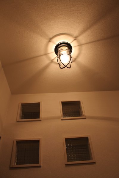 ガラスブロックをうめこんだ階段の壁には、