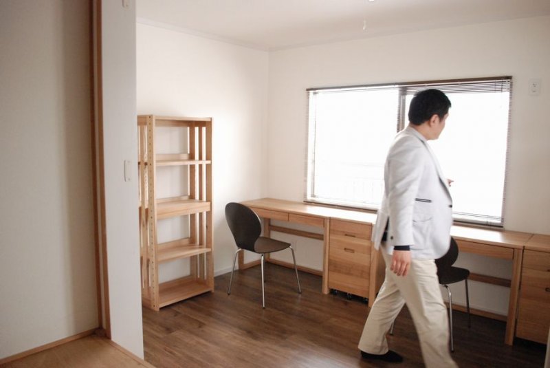 ならんで座れる作りつけのデスクで、楽しくってお勉強にならないかも?(笑)