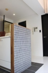 キッチンカウンターにはボーダータイルを使って白い室内にアクセントを効かせました。