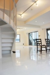 ホームパーティが似合う、ひろーーーいリビングはツヤのあるフロアタイルが印象的。