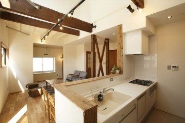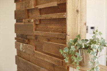 キッチン横の壁には、端材をランダムに貼り付けてデコレーション。