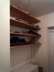 クローゼットを2つ、玄関やサニタリーにも棚をつけました。