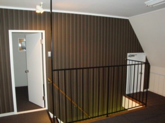 まっしろな壁にグリーンのアクセント、古木の階段、レトロなランプ。